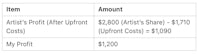 After accounting for the upfront production costs, here is the breakdown of the artist's profit and my profit: