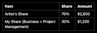 The artist and I will share the profits based on the agreed-upon split, with the artist receiving 70% and my share covering the business and project management services.